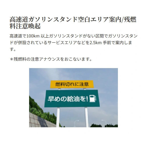 高速道で100km 以上ガソリンスタンドがない区間でガソリンスタンドが併設されているサービスエリアなどを2.5km 手前で案内します。