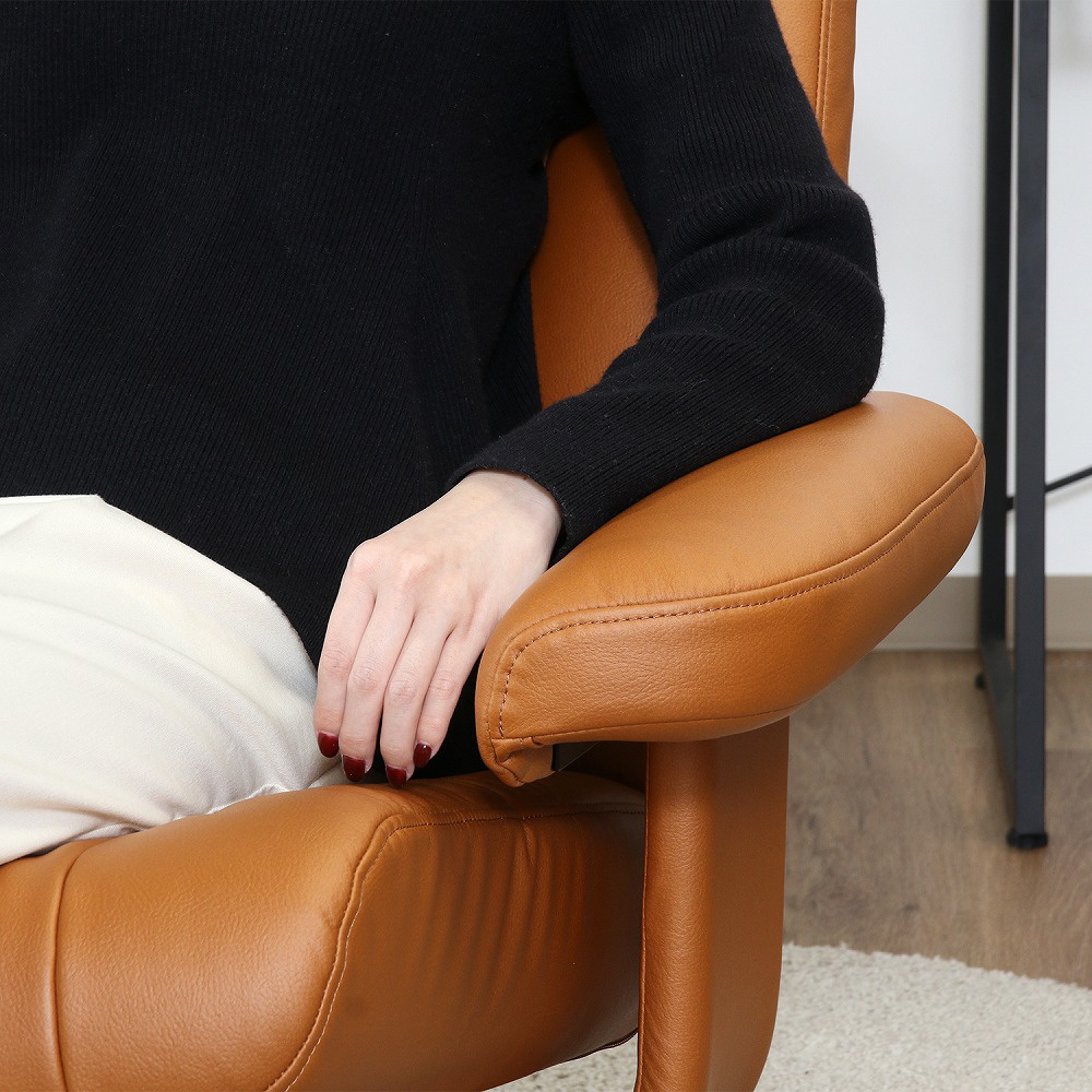 重厚感のある形で身体をしっかり受け止めてくれるパーソナルチェアです。