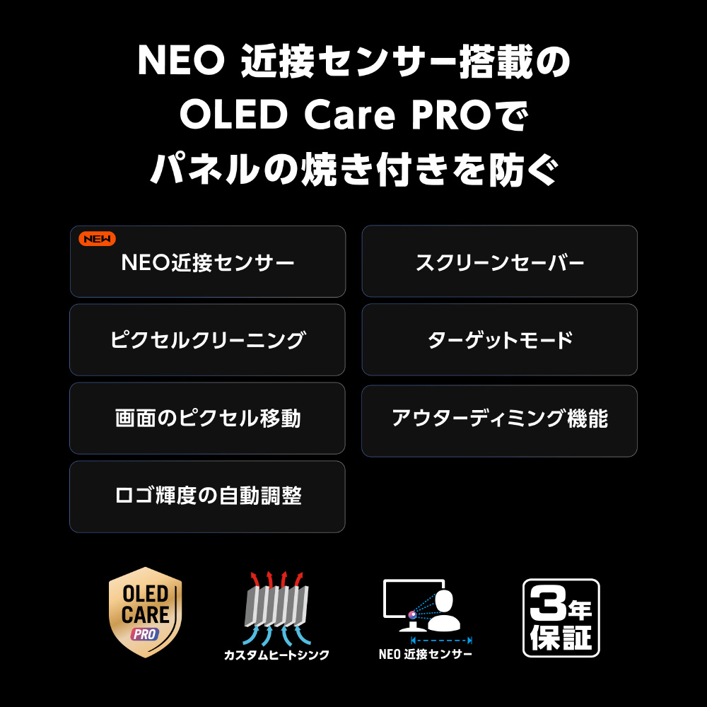 ROG OLEDモニターは、美しい映像を末永く楽しめるように設計されています。革新的なカスタムヒートシンクと独自の内部エアフロー設計により冷却効率を高め、焼き付きのリスクを抑えます。また、ROGモニターには3年保証が付いています。