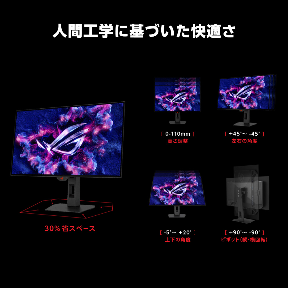 新しいROG Strix OLEDシリーズのモニターは、前世代のXGモニターより30%小型化された新しいコンパクトスタンドを採用。貴重なデスクスペースをキーボードとマウスのために解放します。スタンドは、最適な視聴位置に調整できるよう、前後の角度、左右の角度、画面の高さを調節できます。また、VESA規格の壁掛けマウントにも対応しています。