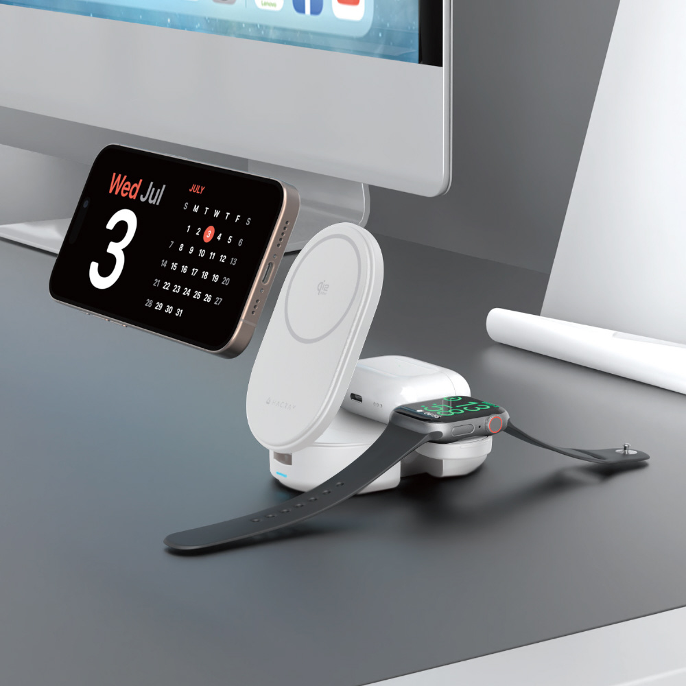Hacray(ハクライ)3in1 折りたたみワイヤレス充電スタンドは、iPhone・Apple Watch・AirPodsが3台同時に充電できるコンパクトなワイヤレス充電スタンドです。
