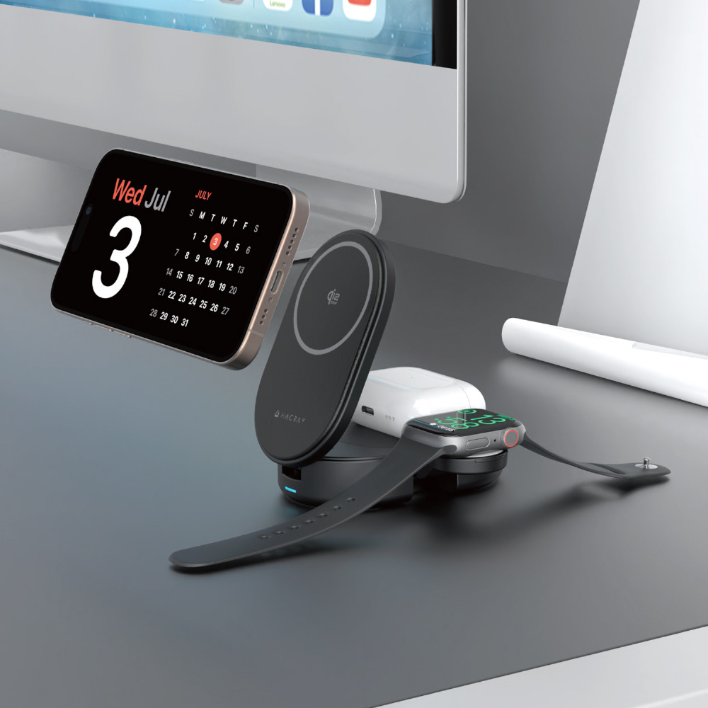 Hacray(ハクライ)3in1 折りたたみワイヤレス充電スタンドは、iPhone・Apple Watch・AirPodsが3台同時に充電できるコンパクトなワイヤレス充電スタンドです。