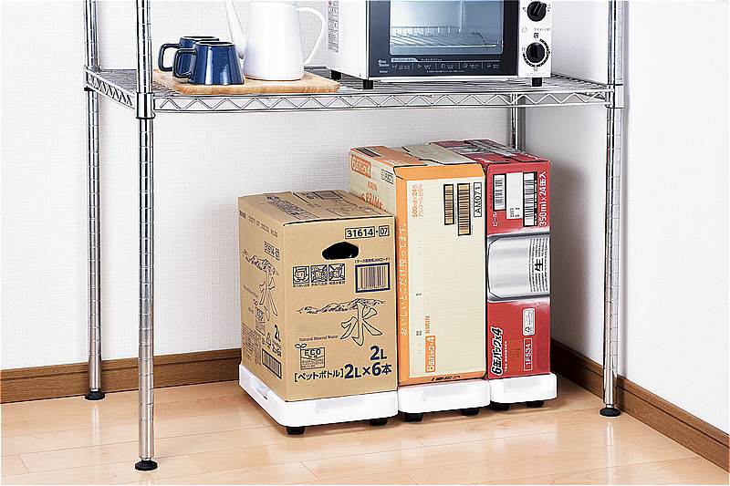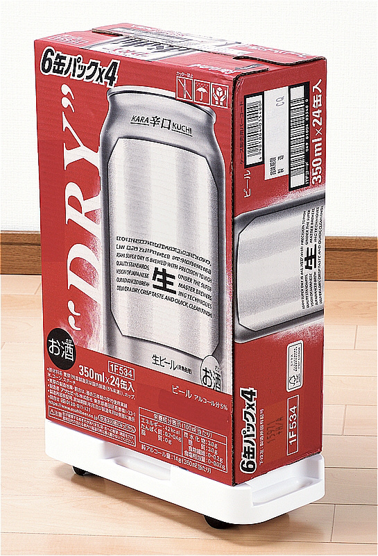 連結できる平台車。用途に合わせた組み合わせで使用できる。縦・横に連結できる。Sサイズ350ml缶×24本のケースにぴったり。耐荷重(20kg)以内で使用してください。 床面の材質によっては傷がついたり、へこみが残る場合がありますので注意してください。連結して使用する場合でも、1個当たりの耐荷重を超えないように使用してください。ジョイントを使用しない時は、本体裏面に収納してください。