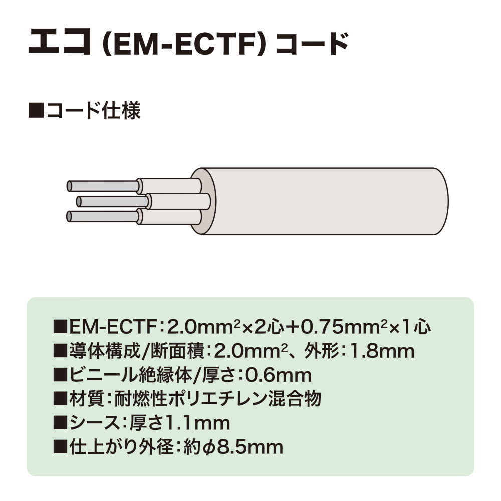 ■塩ビを使用しないハロゲンフリーのエココード(エコケーブル)を採用しています。耐燃性ポリエチレン混合物を使用して、燃やしてもダイオキシンが発生いたしません。環境負荷の軽減を目指すオフィス、工場などに最適です。