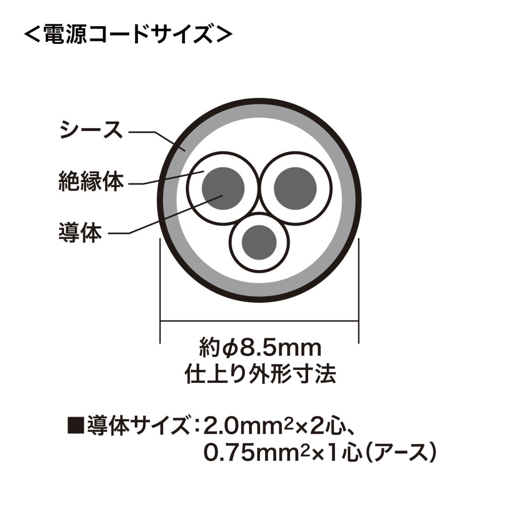 環境に優しいケーブルを使用、抜け止めタイプのタップ。マグネット付き。3P・2個口・5m。