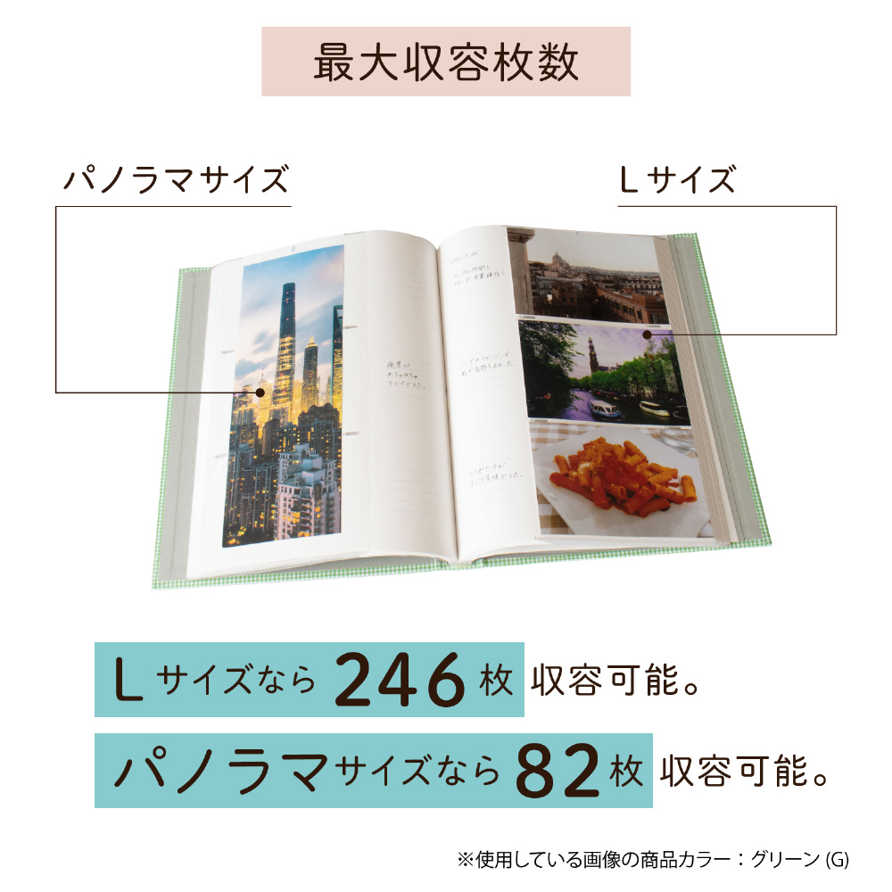 ・写真収容枚数: E・Lサイズ246枚、またはパノラマ82枚