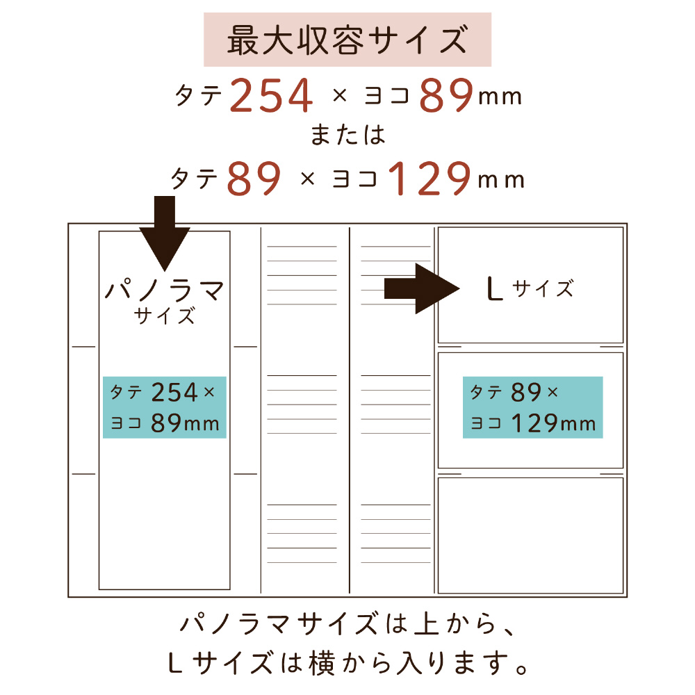 ■E、L、パノラマが一緒に収容できる兼用タイプ。ネガポケット兼用台紙は、写真・ネガフィルムのどちらでも収容できます。