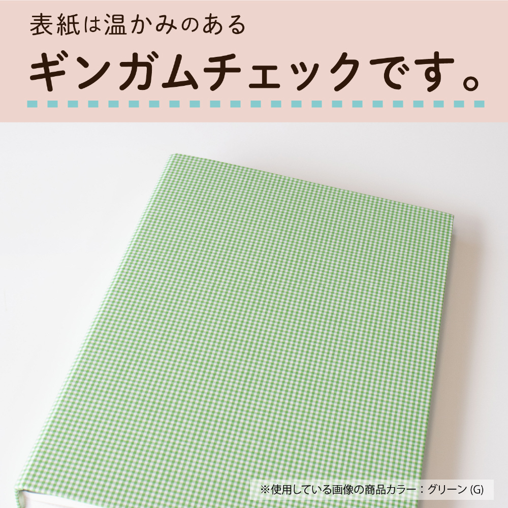 キュートなギンガムチェックの布貼り表紙。コメントが書き込める台紙です。