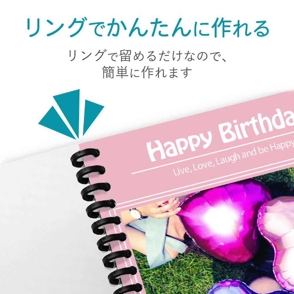 写真用紙と製本用リング、表紙、裏表紙がセットになっていますので、写真用紙に印刷してリングで止めるだけで簡単に製本ができます。