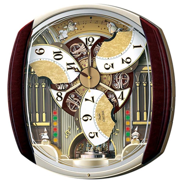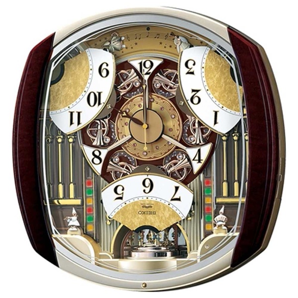 ■質感の高い電波掛時計の落ち着いた表情が、毎正時に始まるパフォーマンスとともに華やかな音楽会会場に一変します。音符のディスクやラッパの飾りの楽しい動き、LEDライトの光のパフォーマンスを美しいメロディとともにお楽しみいただけます。