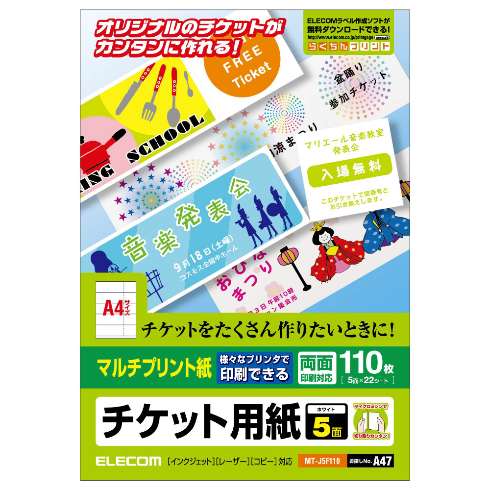 “チケット用紙” マルチプリント紙 両面印刷対応 (A4サイズ:5面・22シート:110枚分) MT-J5F110