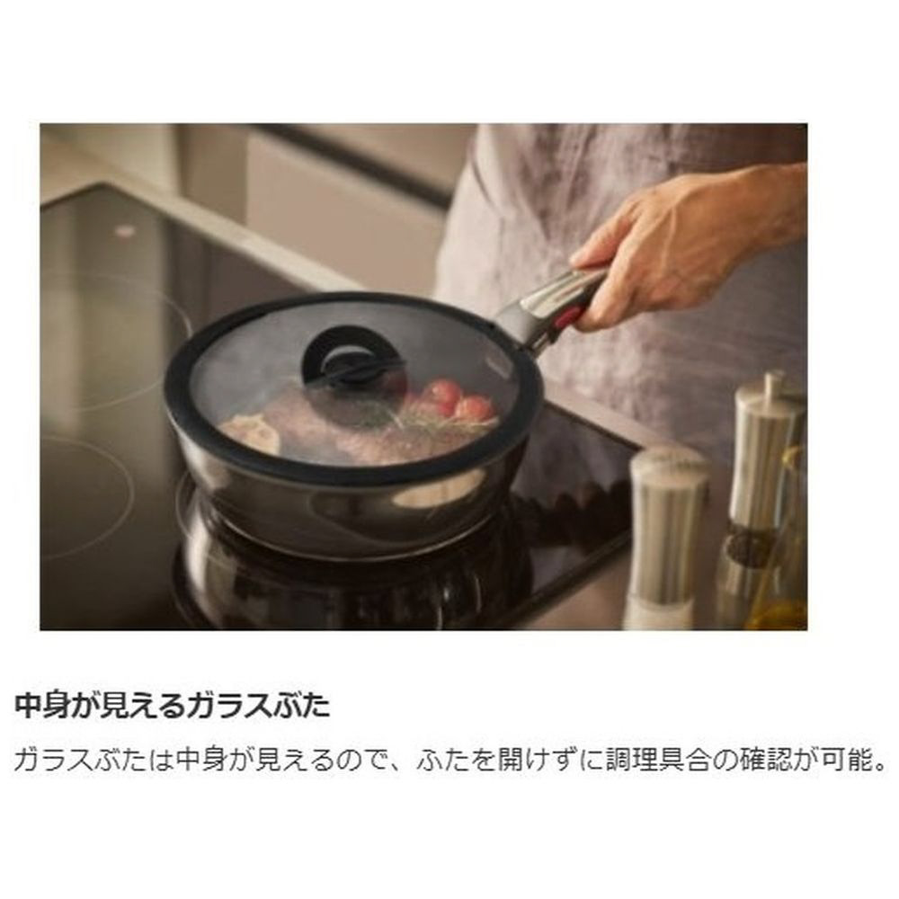 コンパクトに収納できるインジニオ・ネオ シリーズ専用のガラス蓋。シリコン素材の縁で鍋にしっかり密着し、調理中の確認も簡単。バタフライ式つまみで収納も省スペース。