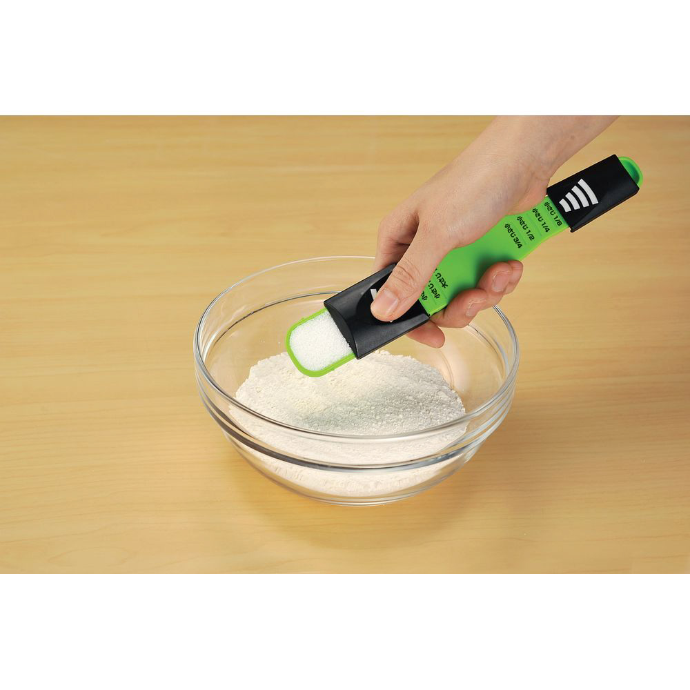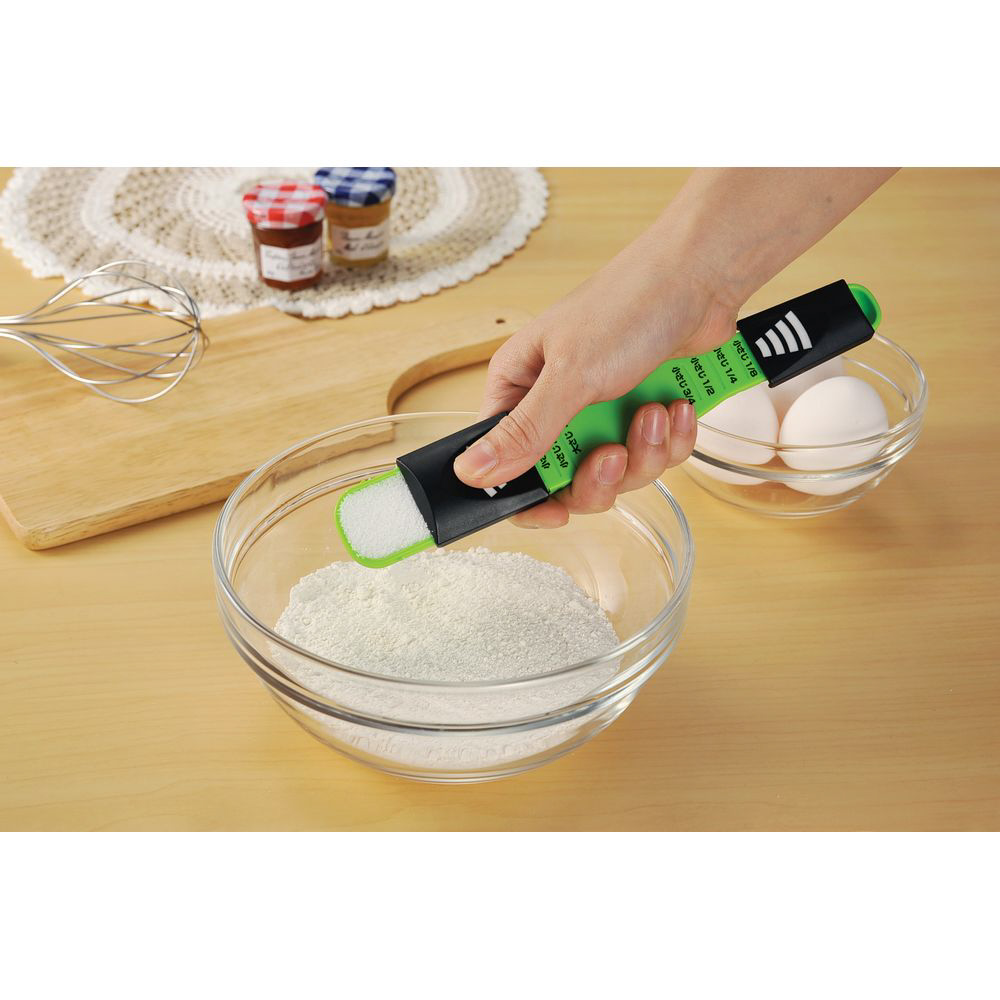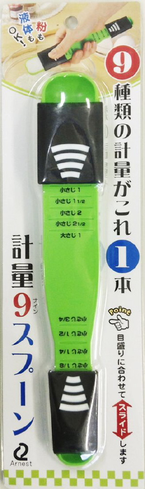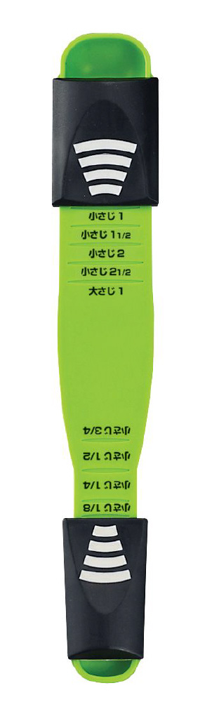 大さじ小さじ 9種類の計量、コレ一本!■目盛りに合わせて計量レバーをスライドさせるだけで、9種類の計量ができます。■いくつもあって探すのが面倒な計量スプーンが1本にまとまっているので、使いたいサイズを使いたい時にさっと計量できます。■大さじ1、小さじ2と1/2、小さじ2、小さじ1と1/2、小さじ1、小さじ3/4、小さじ1/2、小さじ1/4、小さじ1/8 の計9種類の容量が量れます。■粉末だけでなく、醤油やみりん、お酢などの液状のものでもしっかり計ることができます。■いくつもスプーンを使う必要が無いので、これ一本洗うだけでOK。洗い物が減って節水に。計量レバーははずして洗えて清潔です。※食器乾燥機、食器洗い乾燥機は使用できません。