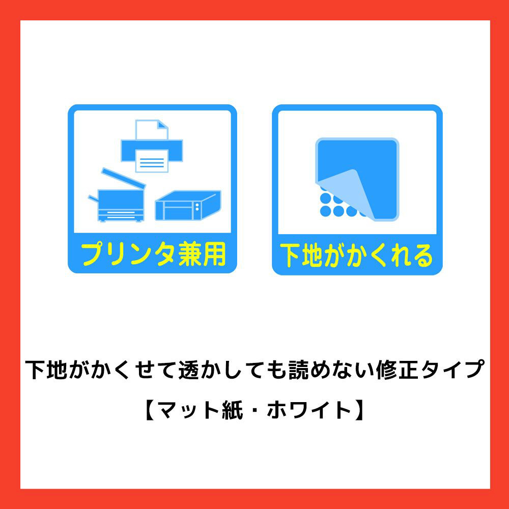 対応プリンタ インクジェットプリンタ(染料系インク・顔料系インクに対応)、カラーレーザー・モノクロレーザー、カラーコピー機、熱転写(カラーレーザー・モノクロレーザーに対応)、ドットインパクトプリンタ、手書き