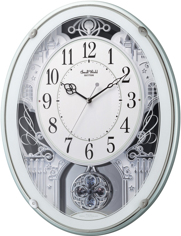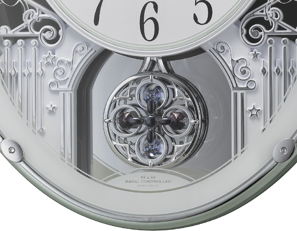 クリスタル留め飾りと、ゆったり振り子付の電波アミュージング時計です。18曲メロディ入りです。