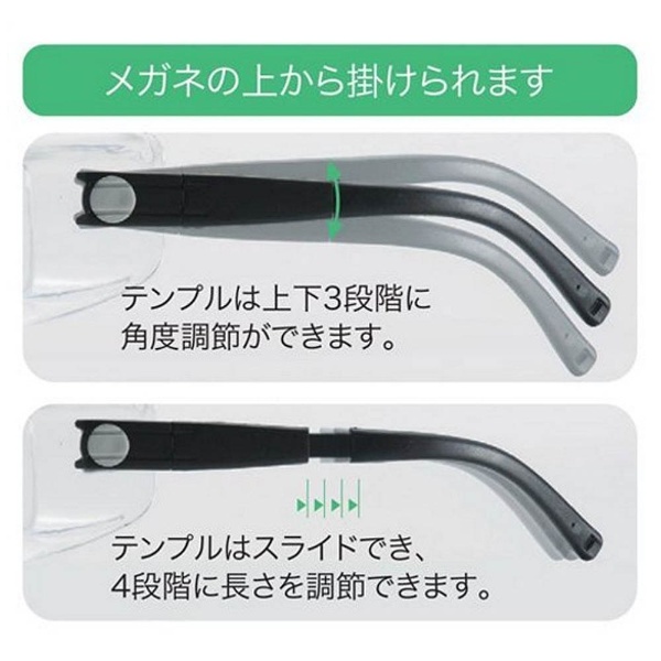テンプルは上下3段階に角度調節ができます。また、スライドさせて4段階に長さを調節できます。