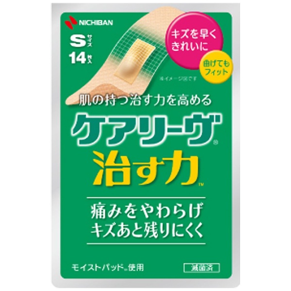 キズを早くきれいに治す。ケアリーヴ「治す力」、誕生。【特長】:1.ハイドロコロイドパッドが、キズを治すのに最適な環境を保ちます。2.テープ部分はケアリーヴ素材(高密度ウレタン不織布)を使用し、関節の動きにやさしくフィットします。【効能効果】:切りキズ、すりキズ、さしキズ、かきキズ、靴ずれ等の創傷及び軽度の熱傷(やけど)の「治癒の促進」、「痛みの軽減」、「湿潤環境の維持」、「保護」。