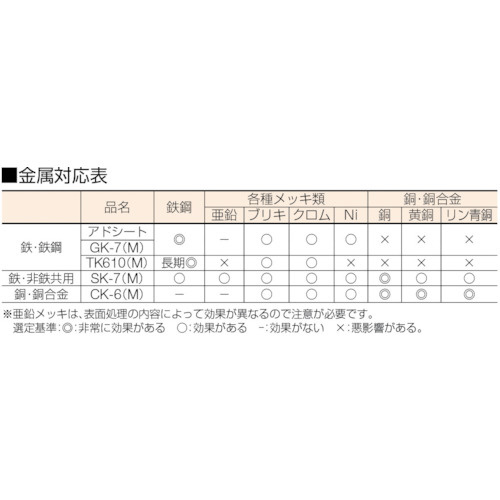 ・亜鉛メッキ、銅、銅合金、銀には悪影響の恐れがあります。使用しないでください