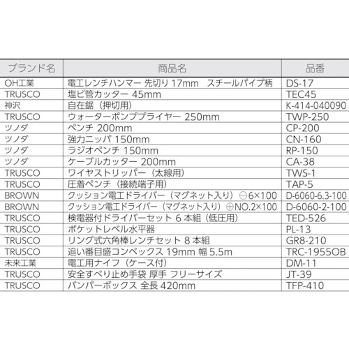 工具箱から手袋まで、電気工事に必要な工具を厳選し、セットにしました。工具箱は、強度、耐久性に優れたバンパーボックスを採用しました。屋外の電気工事はもとより備品としてもご愛用いただけます。