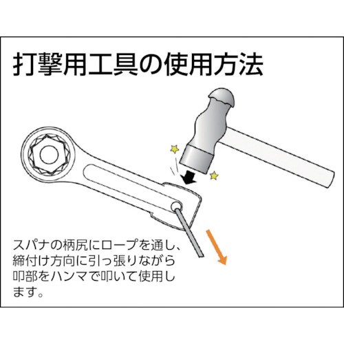 ■柄の後部穴にロープを通し引っ張りながら打撃部をハンマーで叩いて増し締めしたり、サビついたボルト・ナットの緩め作業に最適です。