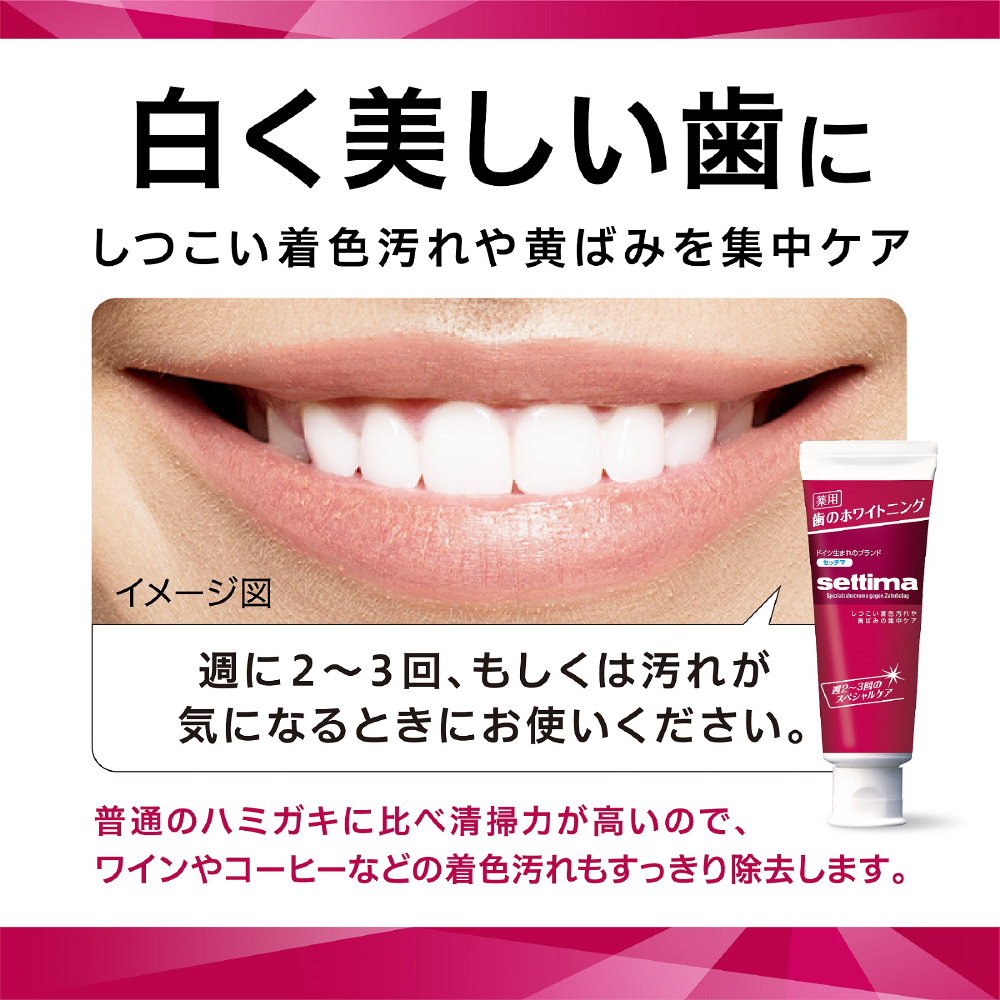 毎日使うタイプの美白ハミガキ。気になる着色汚れをしっかり落とします。歯ぐきの血行を促進し、歯肉炎を予防し、健康な歯ぐきを保ちます。歯質を強化し、ムシ歯を防ぎます。
