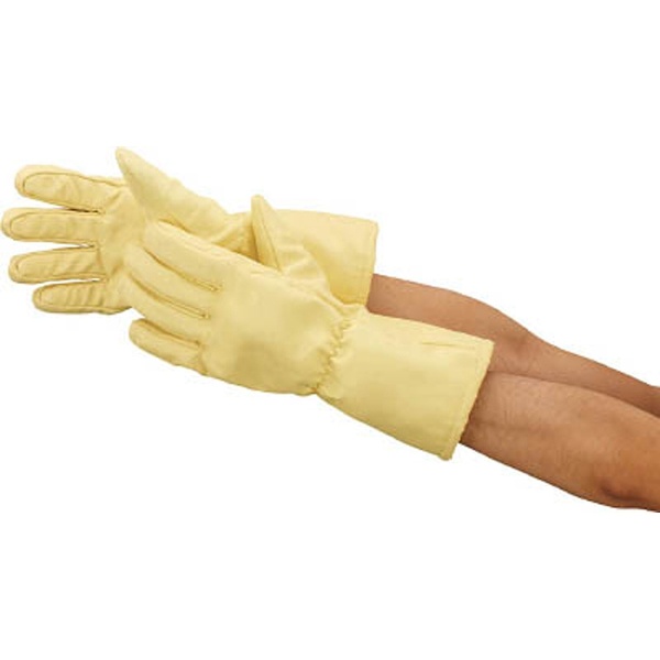 アラミド繊維「ケブラー(R下)」を使用し裏地との中間層にアラミド混フェルト、特殊断熱シートを入れた4層構造になった高耐熱手袋です。