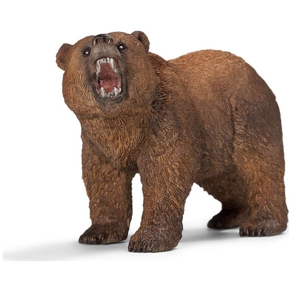 グリズリーベアは背が高く、とても力の強い動物です。立ち上がると2.4メートル、体重は450キロもあります。コブのようなものが背中になり、強靭な後ろ脚を持っています。走るスピードは最高時速55キロ。単独で行動し、性格はとても凶暴。エサのサーモンを捕まえるために複数のグリズリーが水辺に集まることもあります。雑食動物のため、魚、植物、ムースやシカやツキノワグマなどの大型のほ乳類などを主食としています。オオカミや人間から食料を奪うことでも知られています。