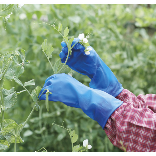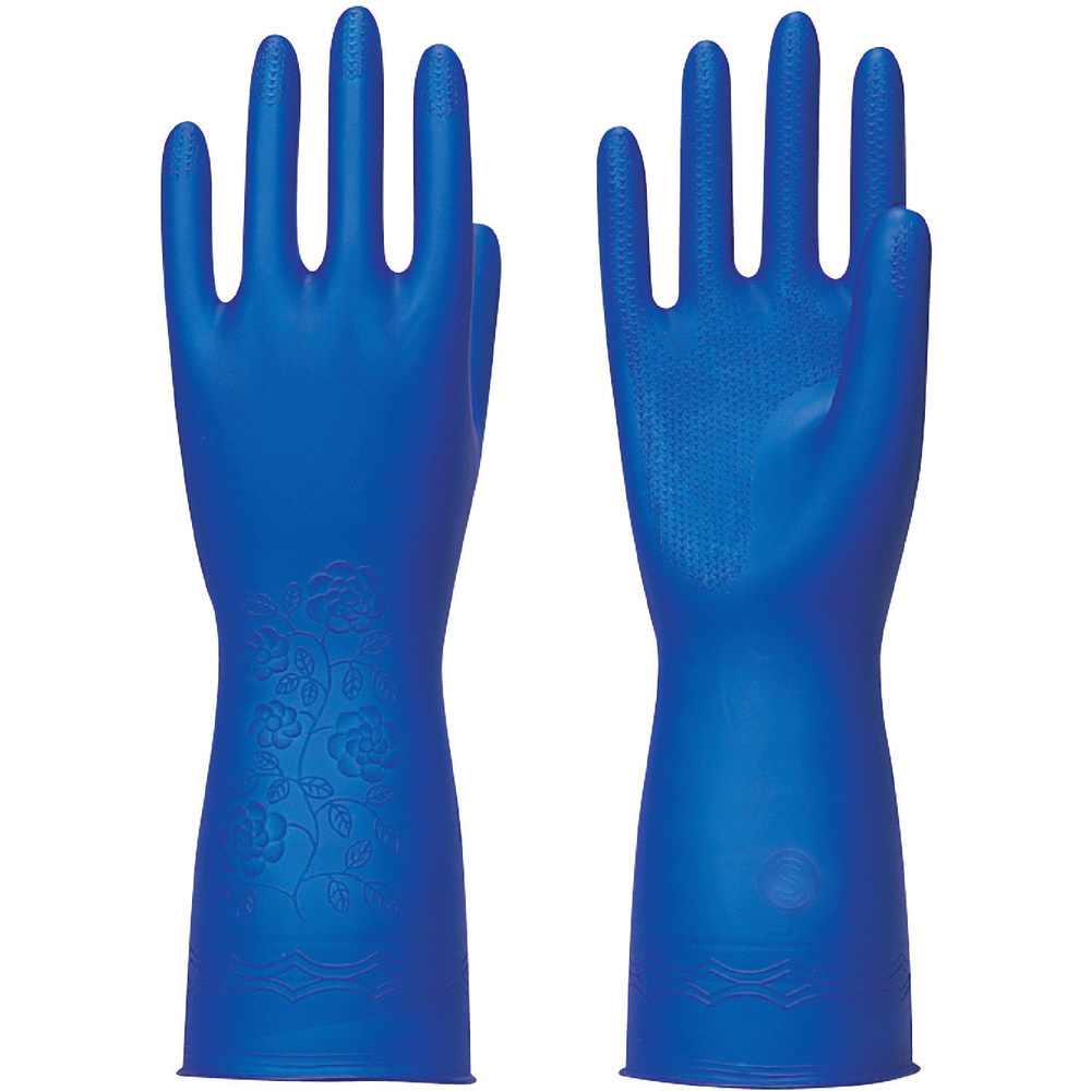 塩化ビニール製で、天然ゴム製に比べて油や洗剤に強い手袋です。