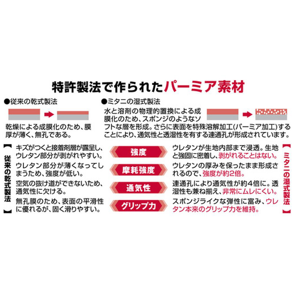 ■新素材パーミア生地(特許製法)を採用しています。従来品よりも「強度2倍」「通気性4倍」の使い易さと快適性を追求した新世代グローブです。