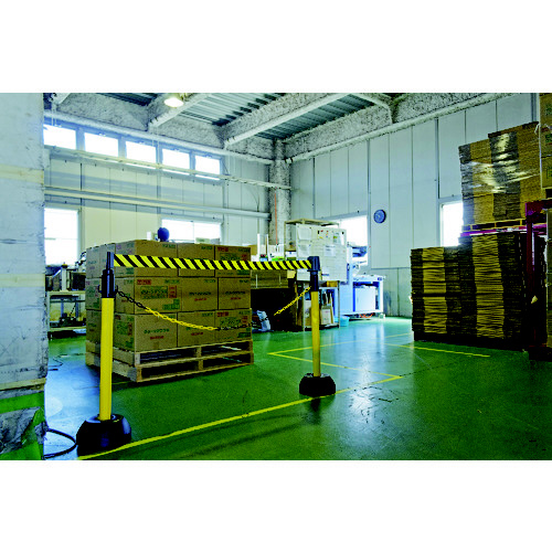 チェーンスタンド(トラスコ T-CSシリーズ)に取り付けるだけで標示テープ(非粘着)を利用した区域管理ができます。
