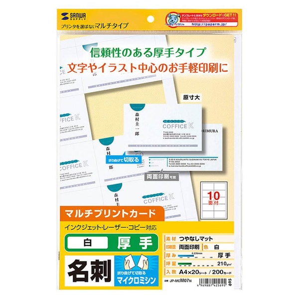 マルチタイプ名刺カード(厚手・200カード分)[各種プリンタ /A4サイズ /20シート 10面] JP-MCM07N