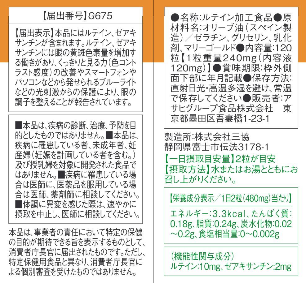 機能性関与成分としてルテインとゼアキサンチンを配合。「本品にはルテイン、ゼアキサンチンが含まれます。ルテイン、ゼアキサンチンには眼の黄斑色素量を維持する働きがあり、コントラスト感度の改善やブルーライトなどの光刺激からの保護により、眼の調子を整えることが報告されています。」という機能性表示を行います。