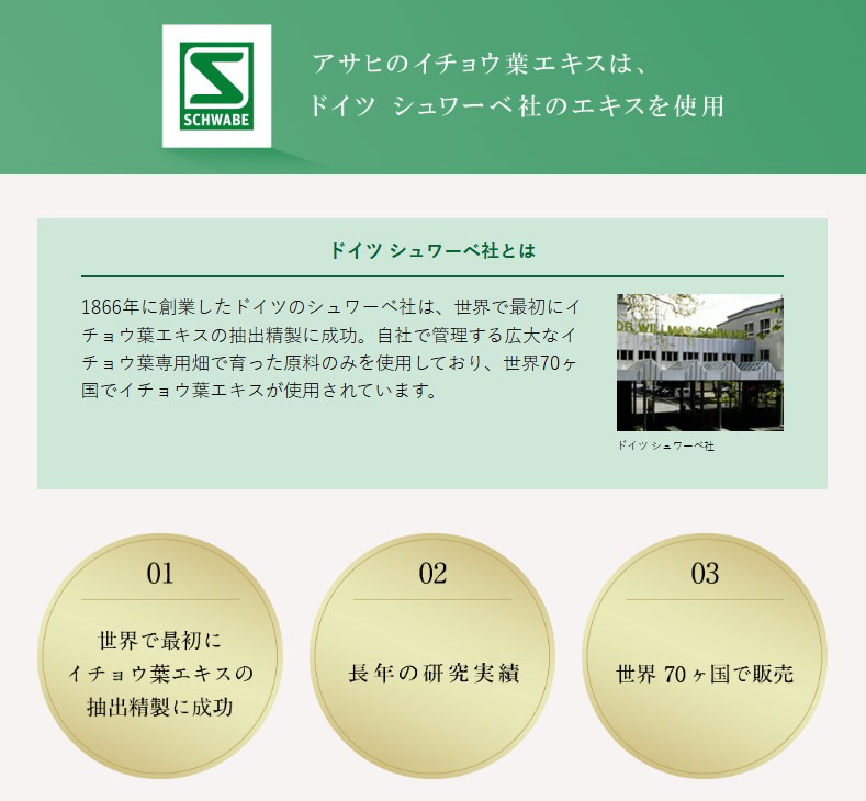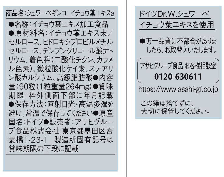 「シュワーベイチョウ葉エキス30日分」は、機能性関与成分としてイチョウ葉由来フラボノイド配糖体、イチョウ葉由来テルペンラクトンが含まれます。