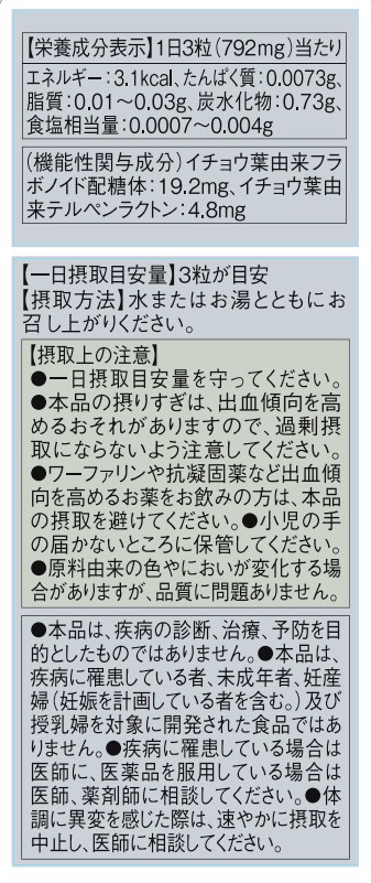 イチョウ葉エキス末/セルロース、ヒドロキシプロピルメチルセルロース、デンプングリコール酸ナトリウム、着色料(二酸化チタン、カラメル色素)、微粒酸化ケイ素、ステアリン酸カルシウム、高級脂肪酸