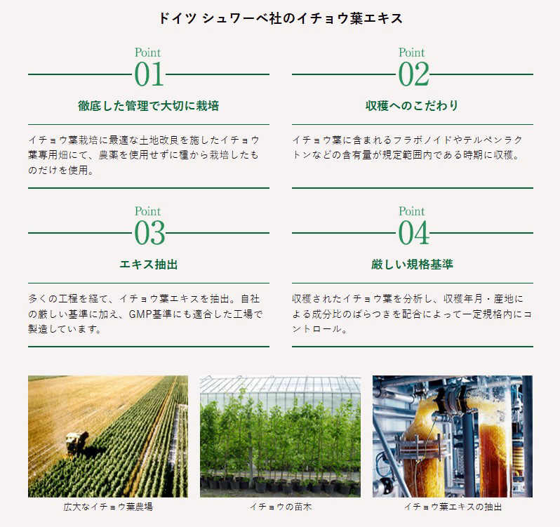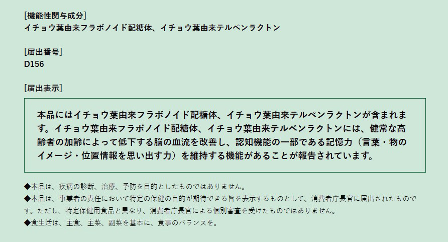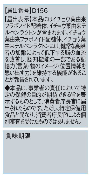機能性関与成分としてイチョウ葉由来フラボノイド配糖体、イチョウ葉由来テルペンラクトンが含まれます。1日3粒を目安にご使用いただくことで、認知機能の一部である記憶力の維持に役立つことが報告されています。