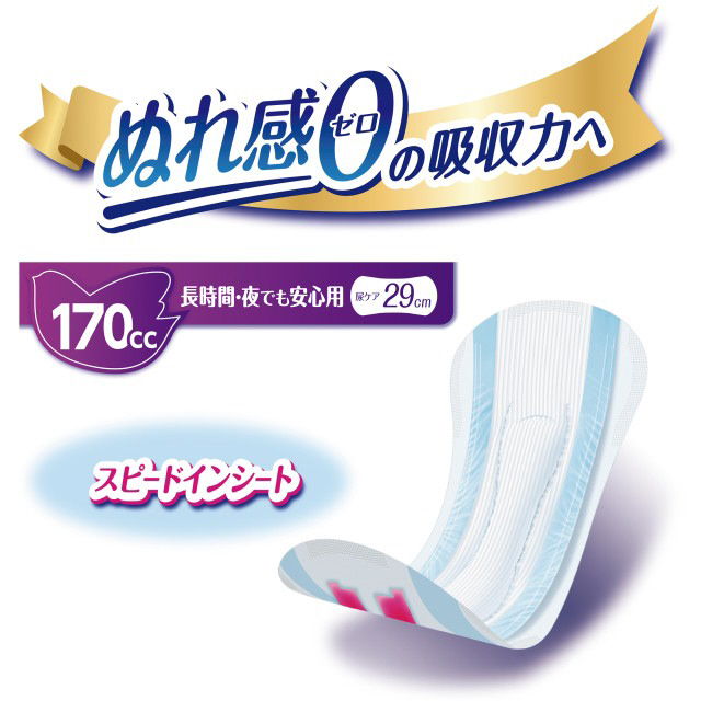 尿成分を研究したサッと引き込みスッと消える世界初スピードインシートなので、出た瞬間から表面に残る間もなく、ぬれ感ゼロの吸収力へ。ニオイを閉じ込める消臭ポリマー※配合。※アンモニアについての消臭効果がみられます。ズレにくさアップ。