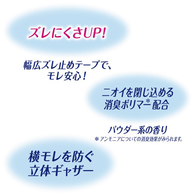 快適ナプキンサイズで瞬間吸収。水分ジェル化ポリマー配合の真ん中ふっくら吸収体がヨレずに体にフィットするからモレ安心。なみなみシートでサラッサラ!消臭ポリマー※配合。※アンモニアについての消臭効果がみられます。