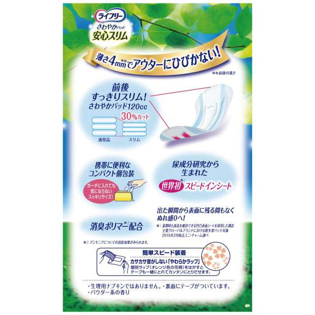 スリムでもしっかり吸収!前後の薄さ約4mmですっきり快適なつけ心地。真ん中ふっくら吸収体でしっかり吸収!消臭ポリマー※配合。やわらかラップ。※アンモニアについての消臭効果がみられます。