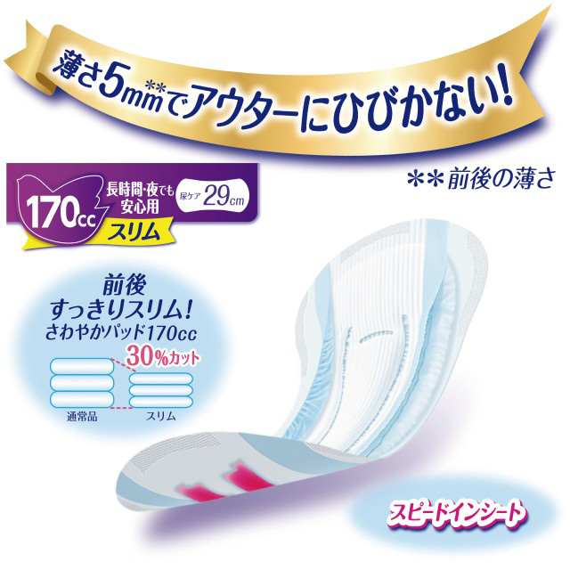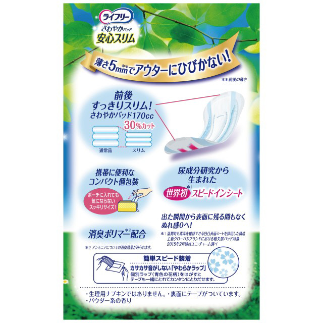 スリムでもしっかり吸収!前後の薄さ約5mmですっきり快適なつけ心地。真ん中ふっくら吸収体でしっかり吸収!消臭ポリマー※配合。やわらかラップ。※アンモニアについての消臭効果がみられます。