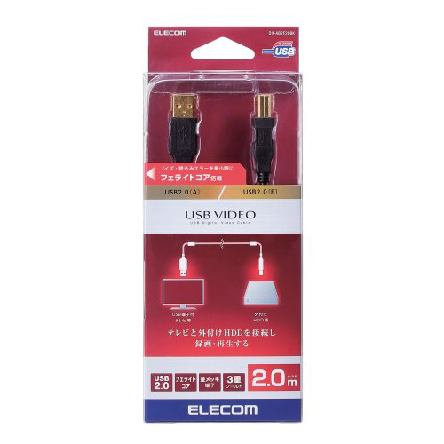 ノイズ・読込みエラーを低減できるフェライトコアを搭載。テレビと外付けHDDを接続し、録画・再生ができるUSB VIDEOケーブル(USB2.0 Standard A-USB2.0 Standard B)。