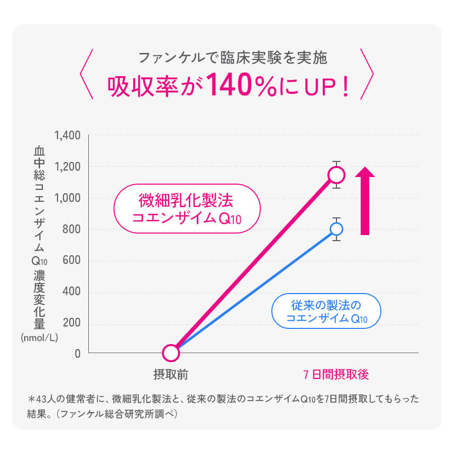 コエンザイムQ10は、エネルギーづくりやサビにアプローチ。若々しさや美しさへと働きかけます。ファンケルの「コエンザイムQ10」は吸収性に着目。1日に摂りたい60mgを2粒でしっかり補給します。