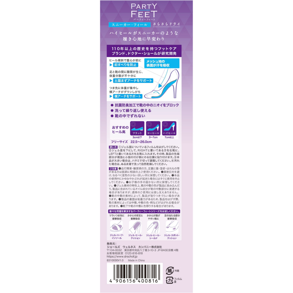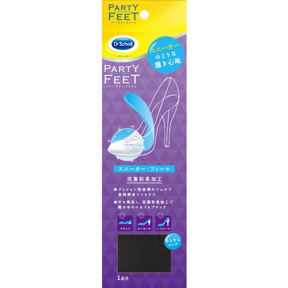 表面がメッシュになって新登場。従来のスニーカーフィールのクッション性はそのままで、足裏をさらさらにキープ&抗菌防臭加工で靴の中のニオイをブロック。「パーティーフィート」はドクターショールが研究・開発したジェルインソールブランド。「パーティーフィート スニーカー・フィール」はハイヒールのためにデザインされたジェルインソールです。やわらかなジェルクッションが前すべりを防ぎ、土踏まずのアーチと全体重がか