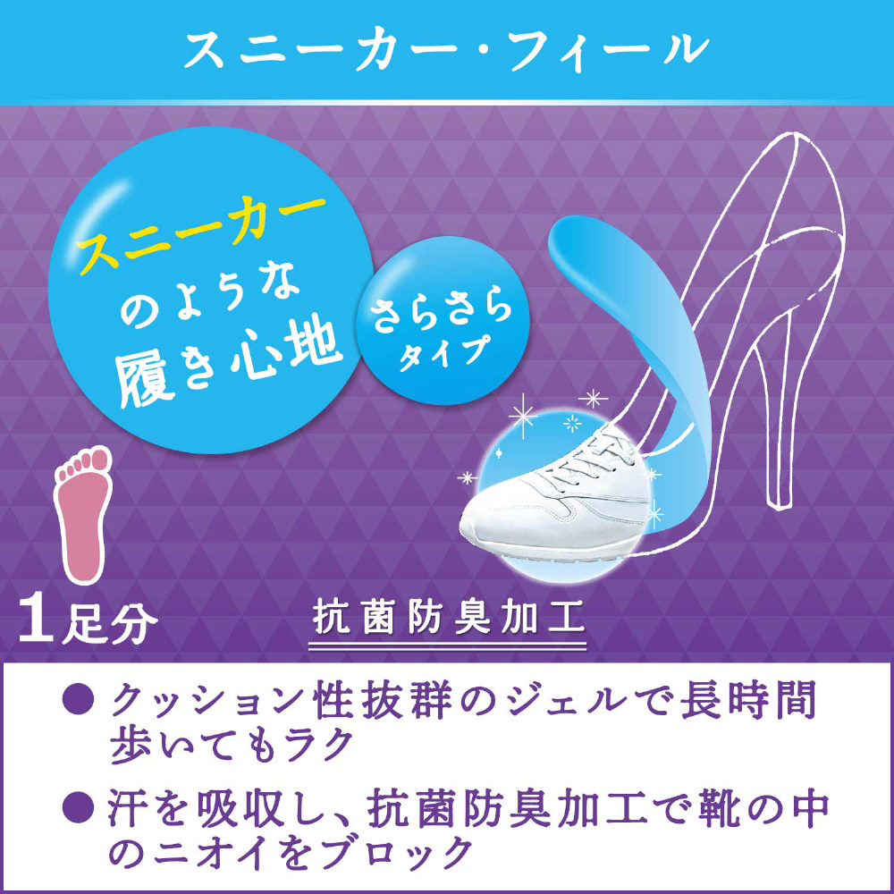 表面がメッシュになって新登場。従来のスニーカーフィールのクッション性はそのままで、足裏をさらさらにキープ&抗菌防臭加工で靴の中のニオイをブロック。「パーティーフィート」はドクターショールが研究・開発したジェルインソールブランド。「パーティーフィート スニーカー・フィール」はハイヒールのためにデザインされたジェルインソールです。やわらかなジェルクッションが前すべりを防ぎ、土踏まずのアーチと全体重がかかって崩れやすい横アーチをしっかりサポート。ハイヒールがまるでスニーカーのような履き心地に生まれ変わります。ハイヒール以外にフラットシューズ、ローヒールの靴にも使えます。