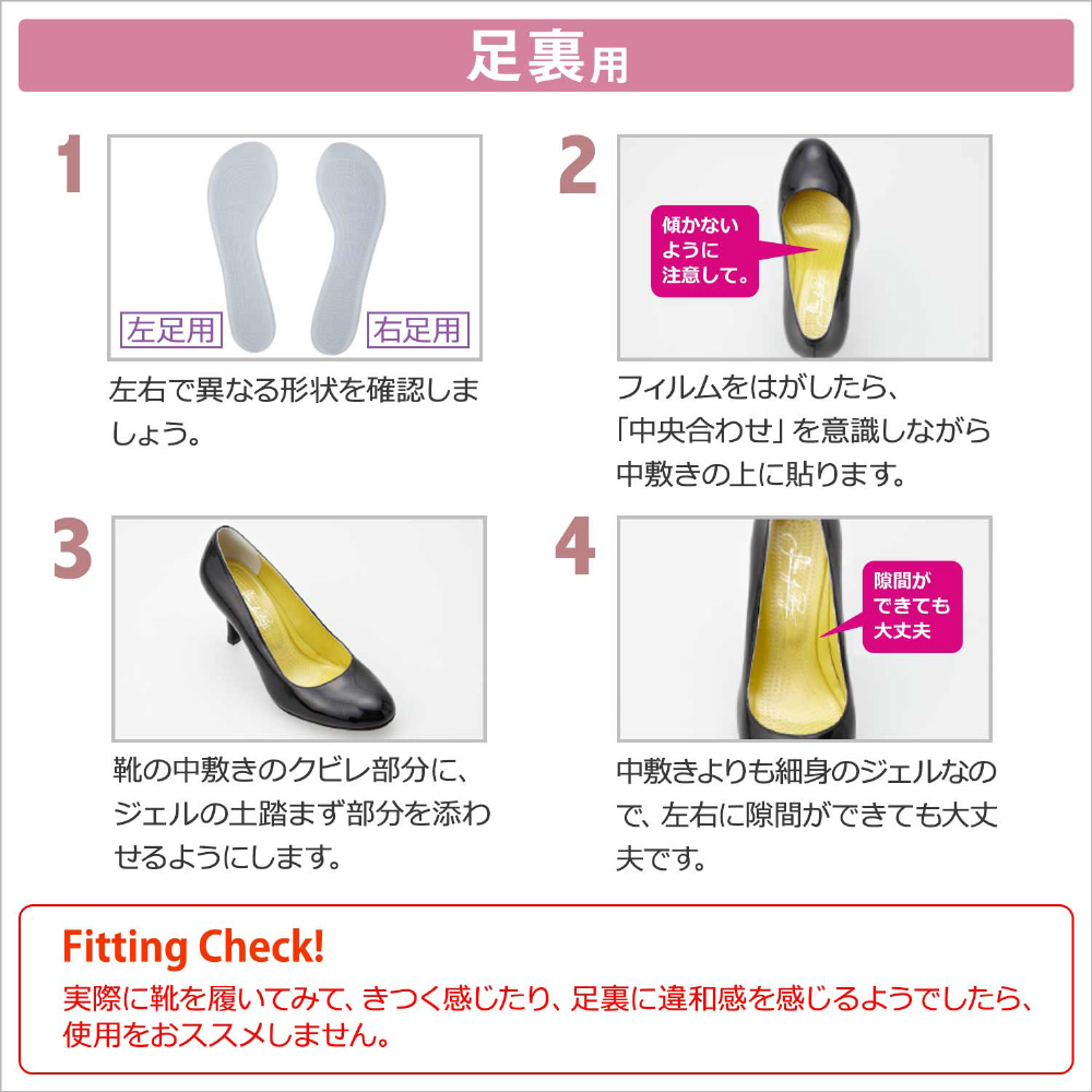 貼付前は、靴の汚れを取り除いてください。1.左右のマークを確認します。「RIGHT」が右足用、「LEFT」が左足用。2.左右を確認後、粘着性のある面のフィルム(プラスチックの台紙)をはがし靴に貼ります。その時、製品の先端部分が親指と小指の付け根にのる位置に貼り付けます。3.不快感や痛みを感じる場合は、貼る位置を調整してください。※貼る位置を調整する場合、一気にはがすと靴の色・柄などがはがれる恐れがありますので、ゆっくりつま先からはがしてください。※汚れたり粘着性が弱くなったりした場合、ぬるま湯で洗い直射日光を避け自然乾燥させてください。繰り返しご使用できます。