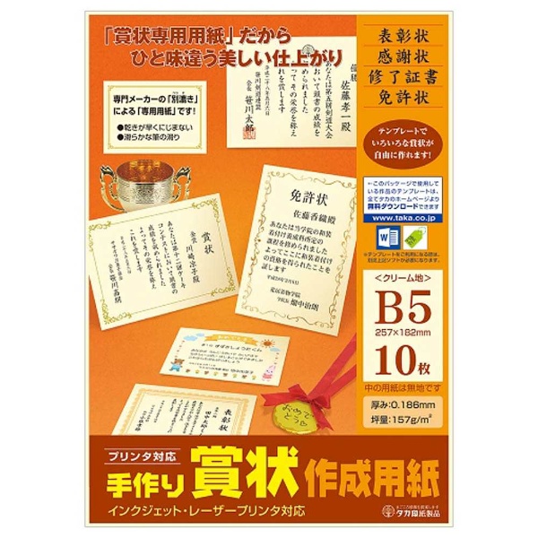 インクジェット/レーザープリンタ対応手作り賞状作成用紙(B5/10枚入り) クリーム 10-1966