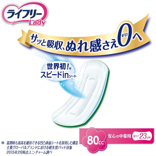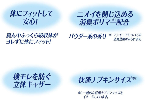 快適ナプキンサイズで瞬間吸収。水分ジェル化ポリマー配合の真ん中ふっくら吸収体がヨレずに体にフィットするからモレ安心。なみなみシートでサラッサラ!消臭ポリマー※配合。※アンモニアについての消臭効果がみられます。