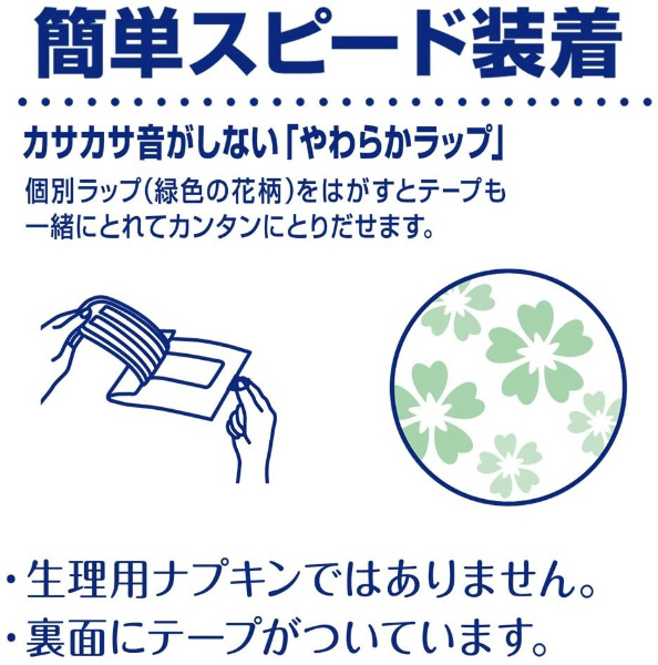 水分ジェル化ポリマー配合の真ん中ふっくら吸収体がヨレずに体にフィットするから多くてもモレ安心。なみなみシートでサラッサラ!消臭ポリマー※配合。やわらかラップ。※アンモニアについての消臭効果がみられます。