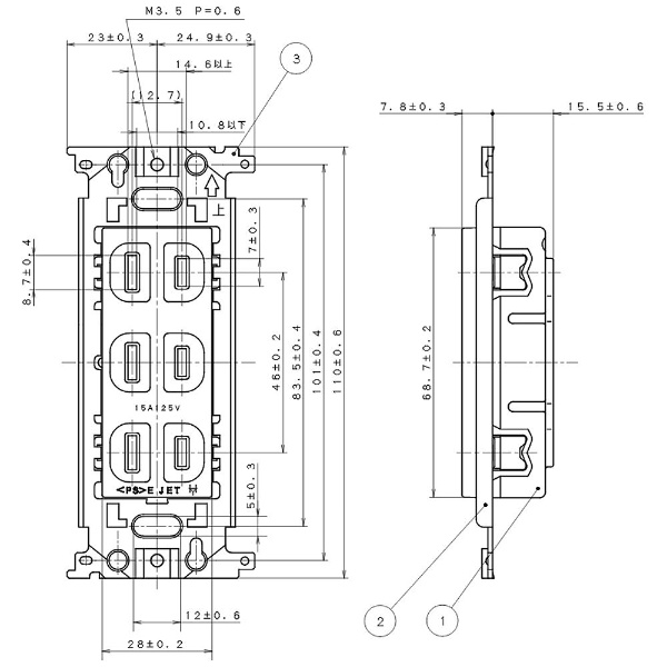 仕様 定格:15A 125V 適合法規:電気用品安全法(特定電気用品) 適合規格:JIS C 8303(配線用差込接続器)に適合。 適用電線:600 Vビニル絶縁電線(IV)、600 Vビニル絶縁ビニルシースケーブル(VVF) 600 V耐燃性ポリエチレン絶縁電線、600 Vポリエチレンケーブル