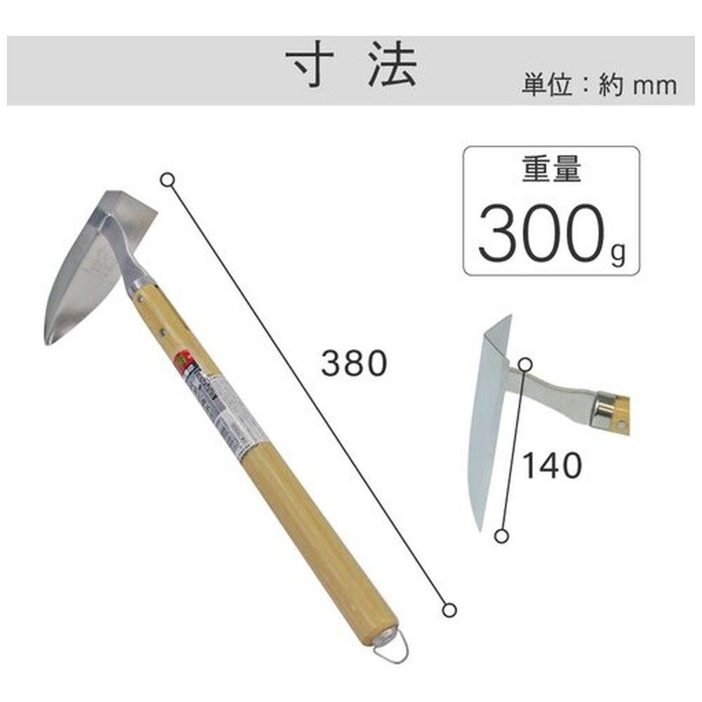 仕様 ■全長(mm):380 ■先幅(mm):※ ■爪長さ(mm):※ ■刃渡り(mm):140 ■柄部長さ:300mm ■頭部板厚:1.6mm ■【材質/仕上げ】 刃先:ステンレス刃物鋼 柄部:天然木 ■原産国:日本 ■質量:300G