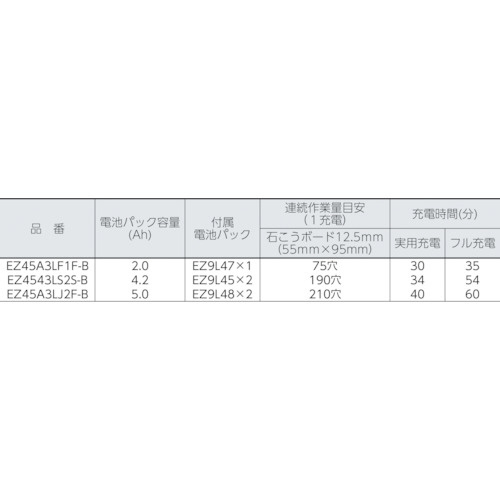 仕様 ■切込深度(mm)石こうボード:30 ■切込深度(mm)木工:15 ■ストローク数(min[[の-1乗]]):6000 ■色:黒 ■電池容量(Ah):5.0 ■付属電池パック:EZ9L48×2 ■充電時間(分)(実用充電、フル充電):40、60 ■作業量(1パック)石膏ボード12.5mm 55mm×95mm:210穴 ■オービタル固定式 ■国際規格(IP5X)試験合格 ■充電時間:40分(実用充電)、60分(フル充電) ■【セット内容/付属品】・ケース・急速充電器(リチウムイオン専用)EZ0L81・電池パックEZ9L48(2個)・六角レンチ・ベースカバー・ダストケース・石こう専用ブレードEZ9SXB10(2枚)(EZ45A3シリーズ)・石こう用ブレードEZ95XB10(1枚)(EZ4543シリーズ)・木工用ブレードEZ95XW10(1枚)(EZ4543シリーズ) ■原産国:日本 ■質量:1.9KG
